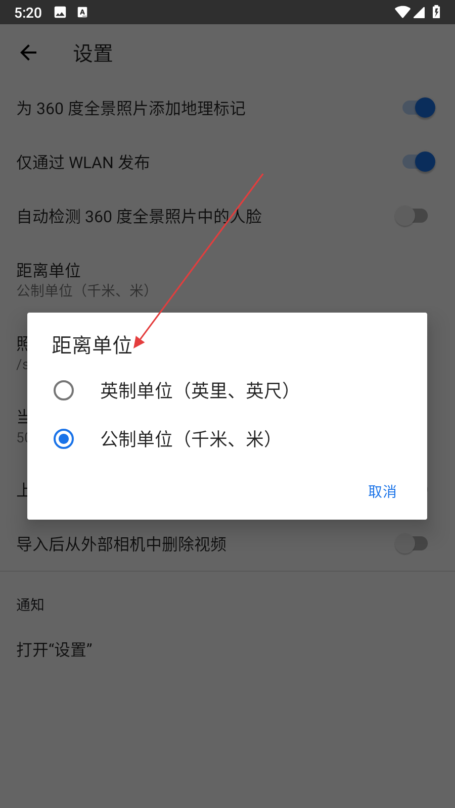 4、在距离单位选择界面,选择需要的距离单位,即可完成谷歌街景距离单位的更改。