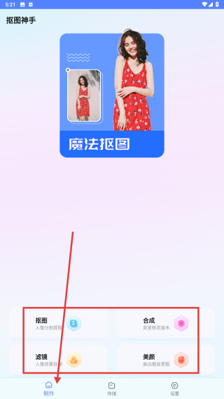 1、打开抠图神手APP,进入创作页面,可使用魔法抠图功能,也能进行抠图、合成、滤镜、美颜等操作。