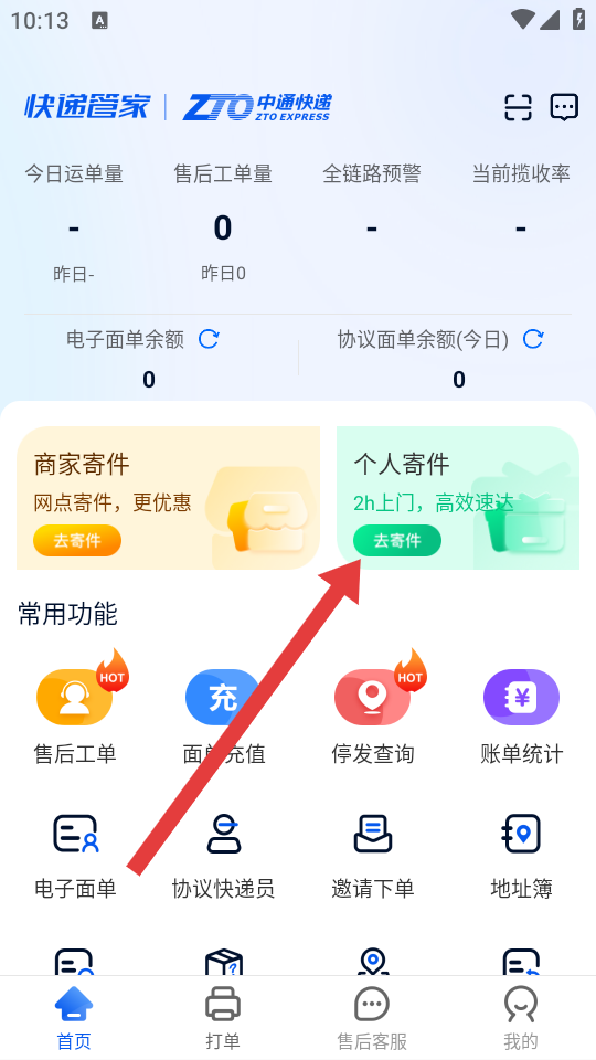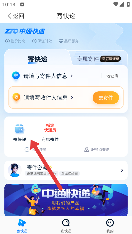 1、打开中通快递APP首页,点击个人寄件模块中的去寄件按钮,进入寄件操作的页面。