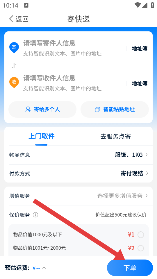 3、填写寄件人、收件人信息,设置物品信息、付款方式等,确认无误后点击底部下单按钮,完成上门取件预约。