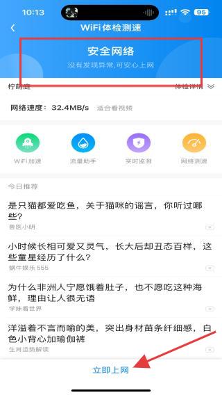 4、测速后显示安全网络,再点击正下方的立即上网的功能按钮。