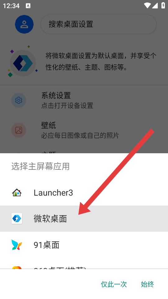 4、在选择主屏幕应用的弹窗中,点击微软桌面,并根据需求选择仅此一次或始终。