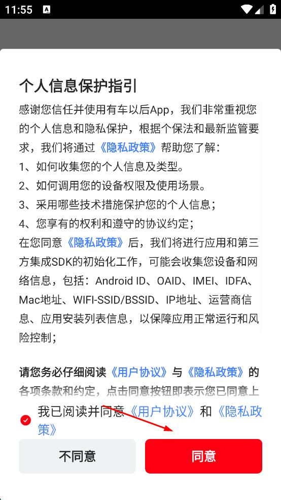 1、打开有车以后APP,在个人信息保护指引界面,勾选“我已阅读并同意《用户协议》和《隐私政策》”,点击同意,进入APP主界面。