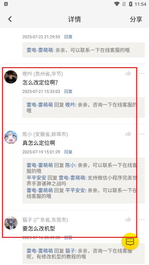 4、在评论区中,能看到关于改定位、改机型等具体操作的用户提问及官方客服的回复,可进一步了解相关操作方法。