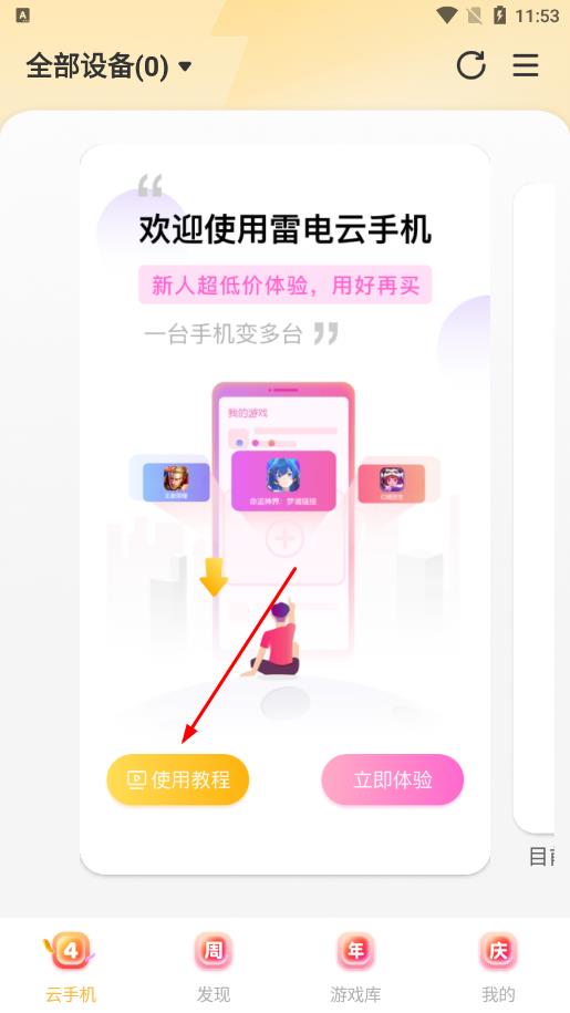 1、打开雷电云手机App,在主界面点击使用教程按钮,可进入新手教程页面。