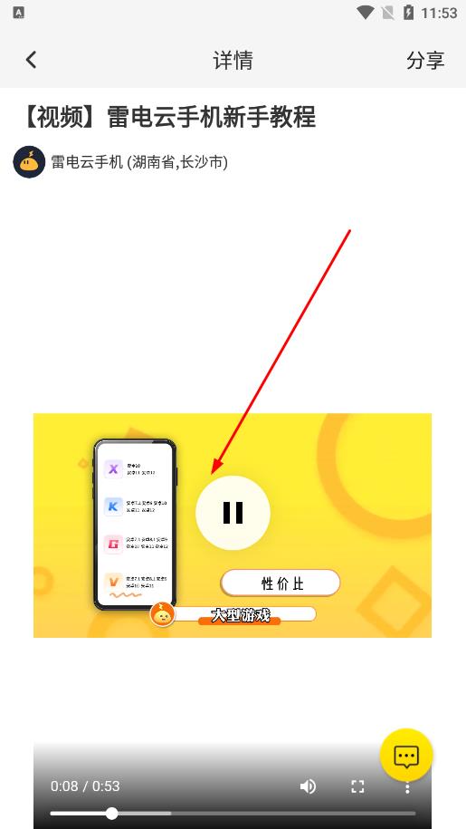 2、进入【视频】雷电云手机新手教程页面,点击视频播放按钮,能观看教程视频,了解雷电云手机基本使用方法。