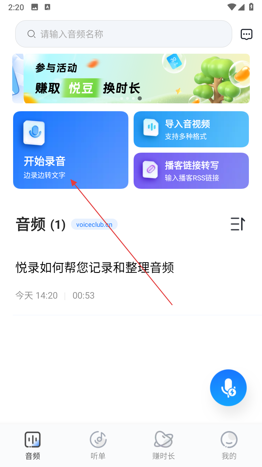 1、打开悦录应用,在主界面点击开始录音按钮,进入录音页面。