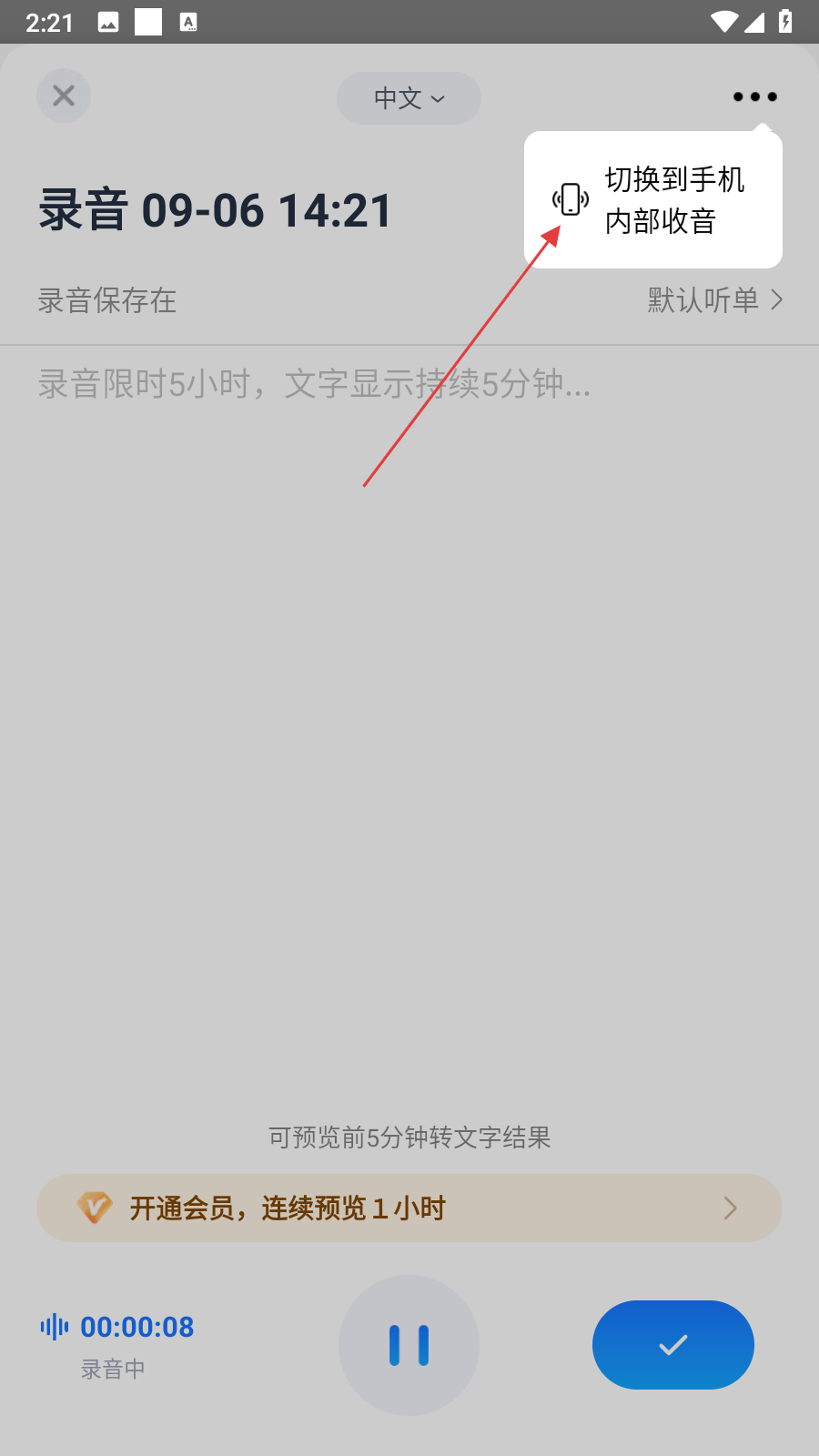 4、点击录音页面右上角的三点图标,切换到手机内部收音模式。