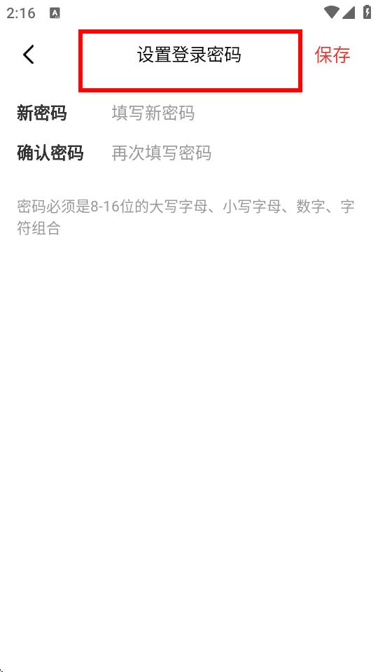 4、在设置登录密码界面,按照要求填写新密码和确认密码,最后点击保存即可完成密码登录设置。