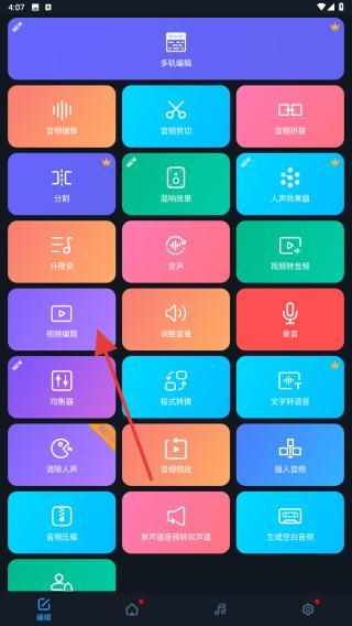 1、打开超级音乐编辑器APP,软件会自动汇总手机内所有音频文件,点击视频编辑的功能图标。