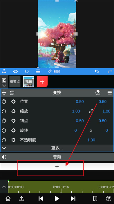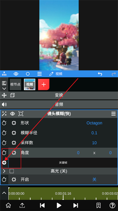 7、如下图可根据自己想要的效果来添加视频关键帧,点击左侧按钮的白色加号,如下图;
