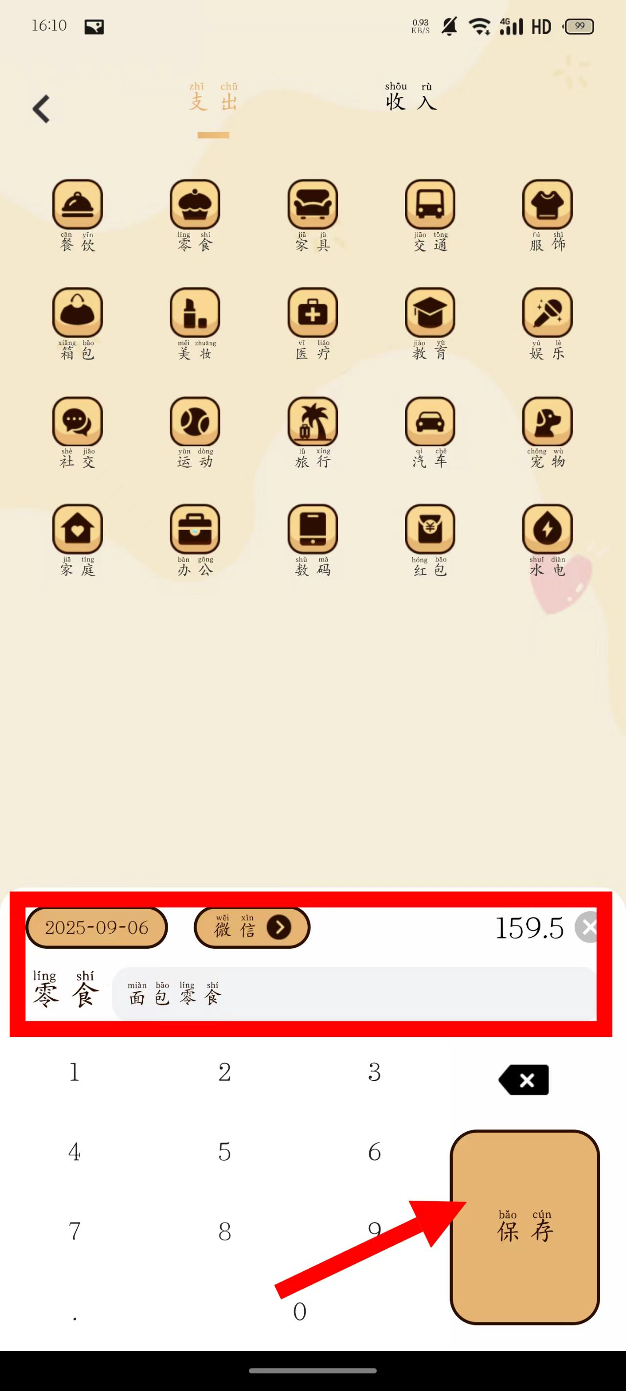 4、确认日期、支付方式等信息无误后,点击保存,即可记录该笔消费账单。