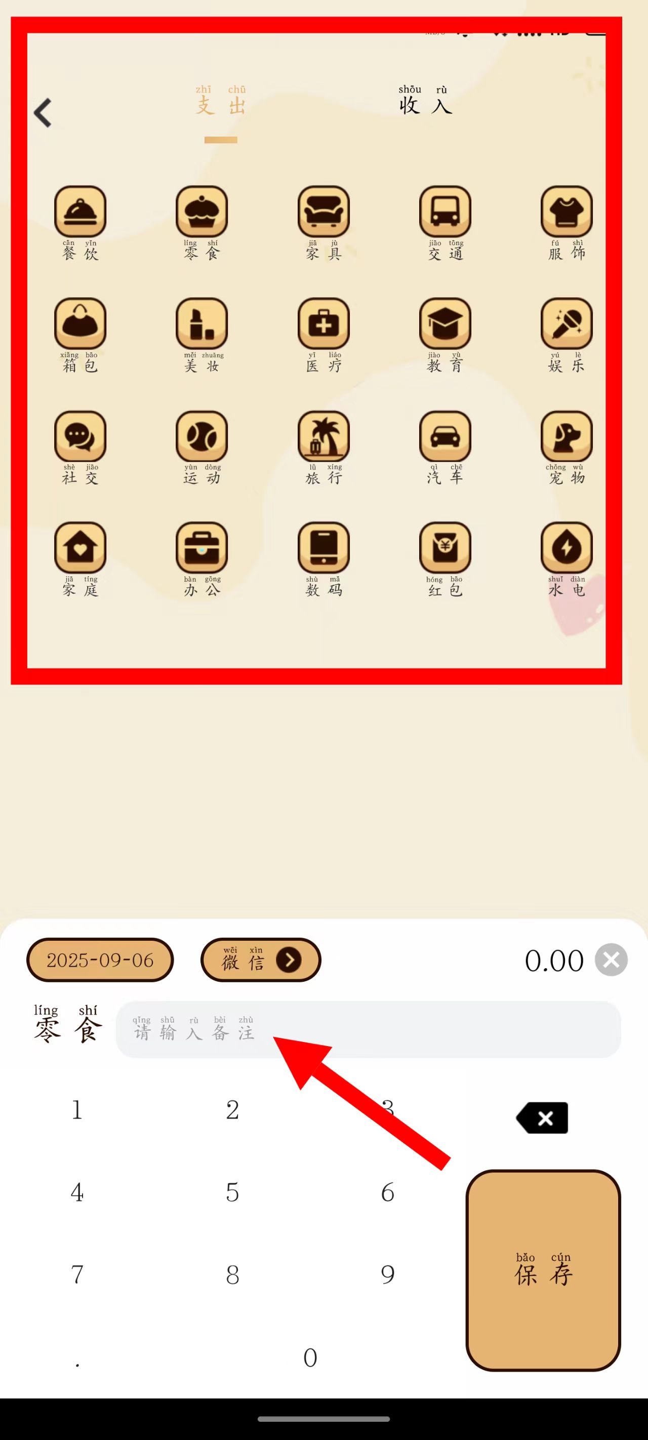 3、选择消费类别,输入消费金额,并在备注栏填写消费详情。