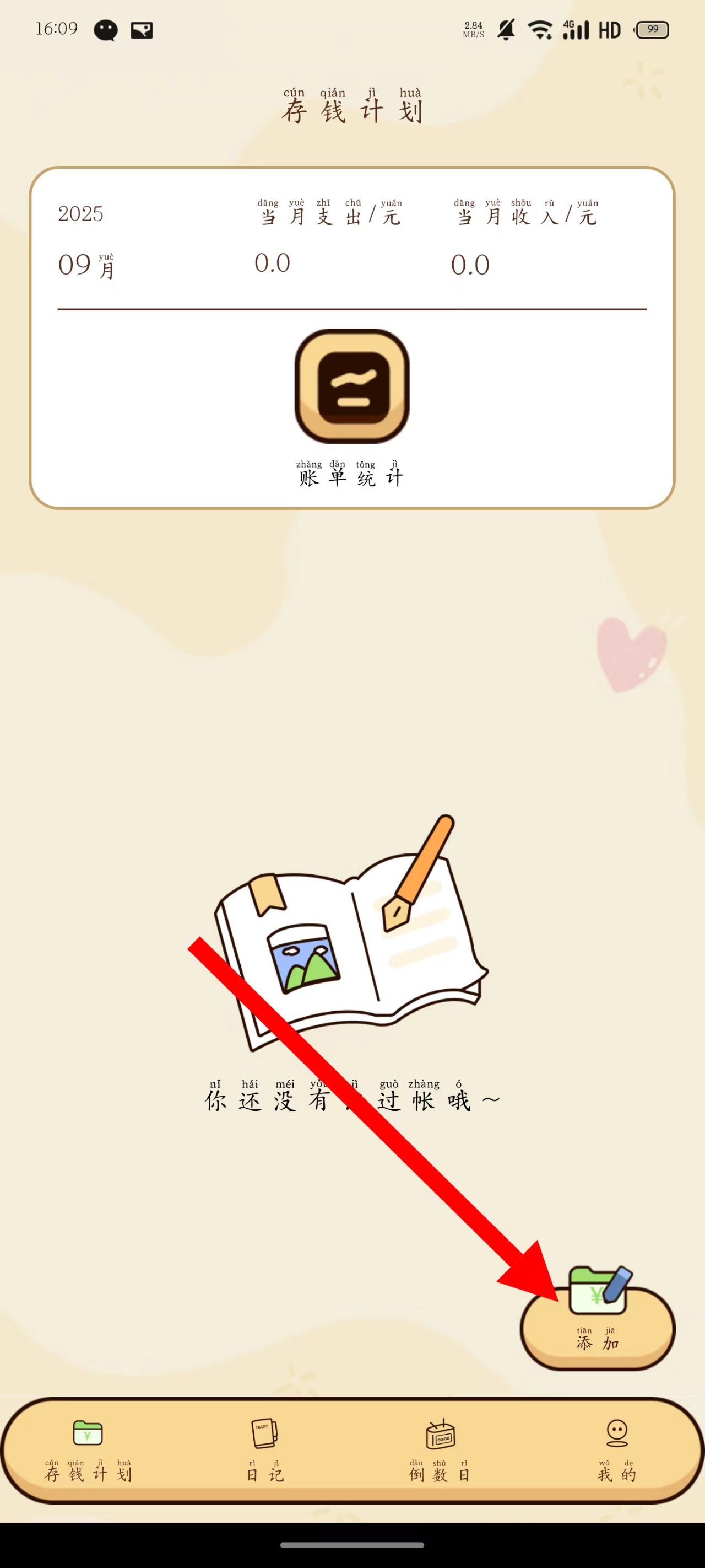 2、在存钱计划页面,点击右下角添加按钮。