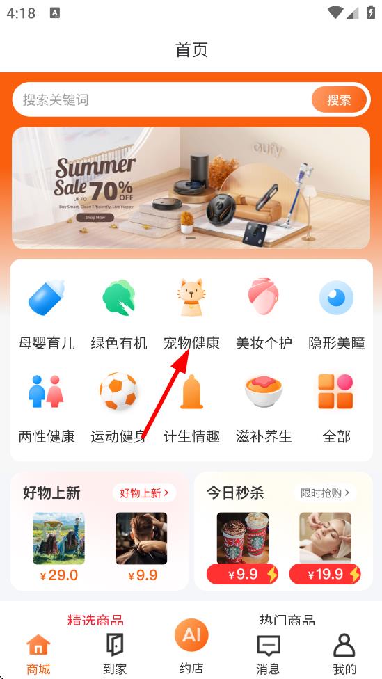 1、在首页,点击宠物健康分类,进入宠物健康商品分类页面。