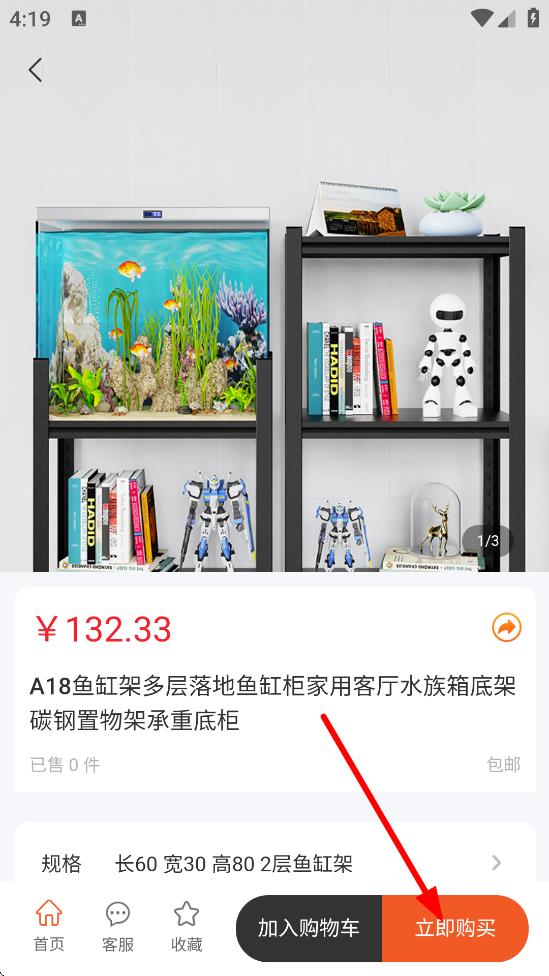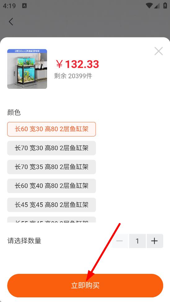 4、在弹出的规格选择框中,选择商品规格和数量后,点击立即购买,进行购买。