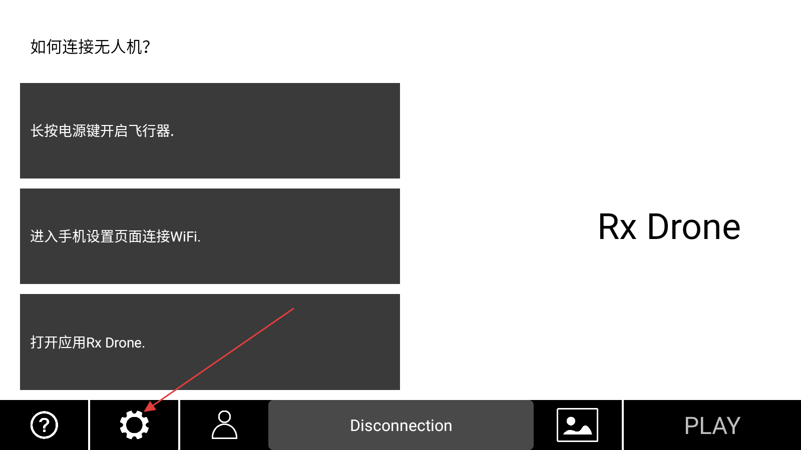 1、在RxDrone应用主界面中,点击齿轮形状的设置图标,进入设置界面。