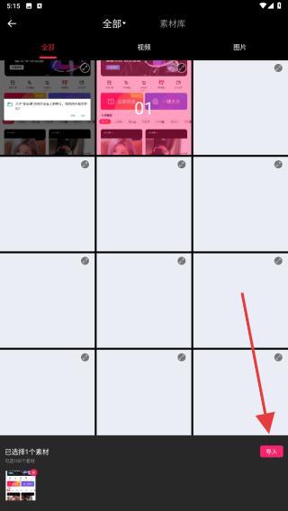 3、进入素材选择界面,从手机相册选中要编辑的图片,点击导入,将图片添加到剪辑轨道。