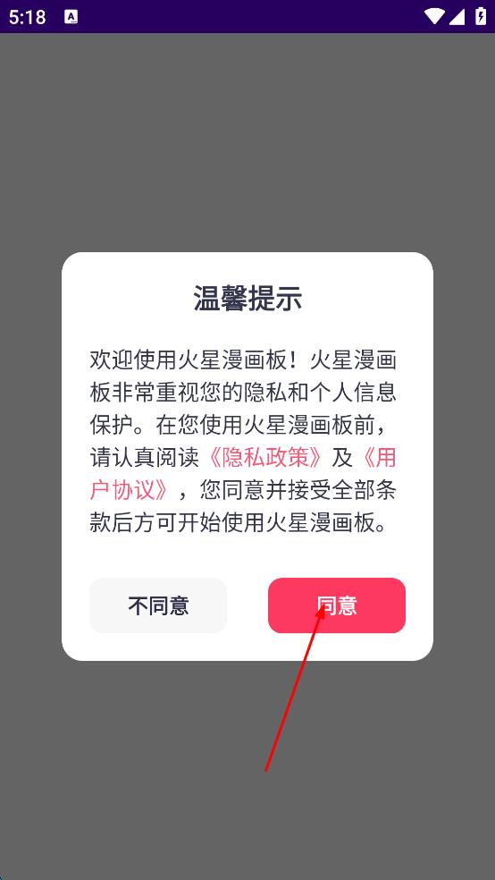 1、打开火星漫画板APP,在温馨提示界面,认真阅读隐私政策及用户协议后,点击同意,进入APP主界面。