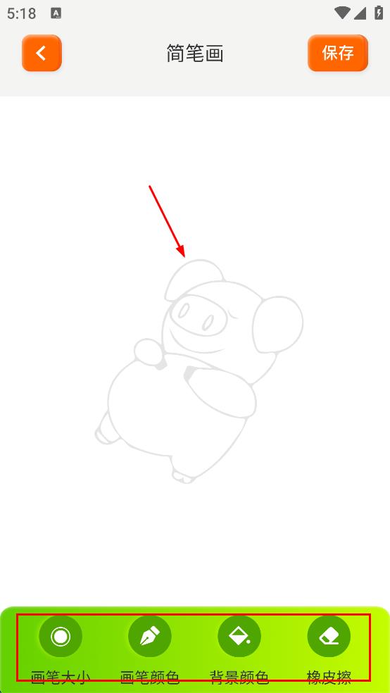 4、在简笔画绘制页面,可调整画笔大小、画笔颜色、背景颜色等绘制参数,然后沿着图案轮廓进行绘制,绘制完成后,点击保存,留存绘制的简笔画。