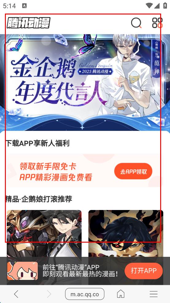 4、进入动漫平台页面后,可查看平台内的各类动漫相关内容,比如推荐的漫画、活动信息等,还能根据提示下载APP,享受更多服务。