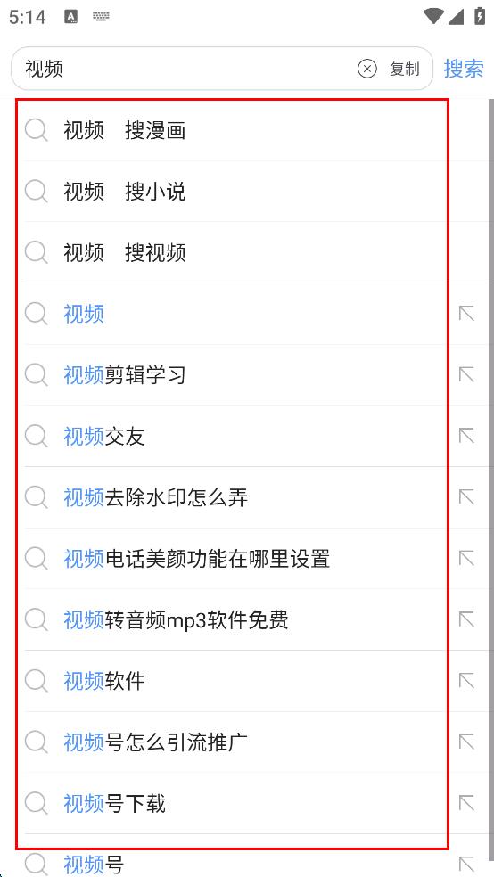 2、在搜索建议列表中,可看到“视频 搜漫画”“视频 搜小说”等多个选项,根据需求选择合适的搜索建议,点击进行搜索。