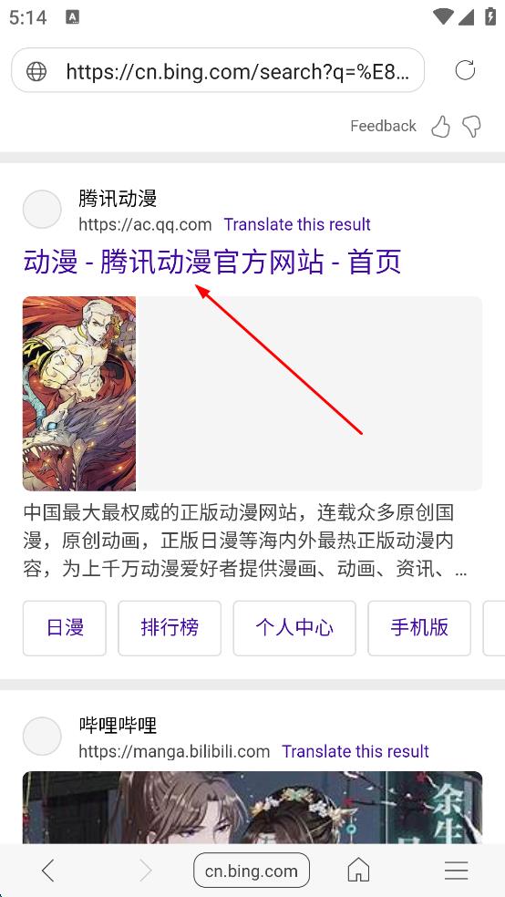 3、搜索完成后,在搜索结果页面,找到像腾讯动漫官方网站这样的动漫平台链接,点击该链接,进入对应的动漫平台页面。