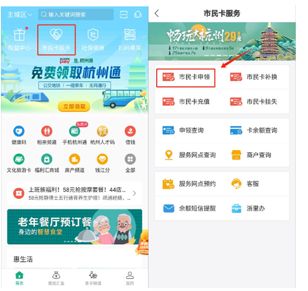 1、进入杭州市民卡APP,进入“市民卡服务”板块,选择“市民卡申领”。