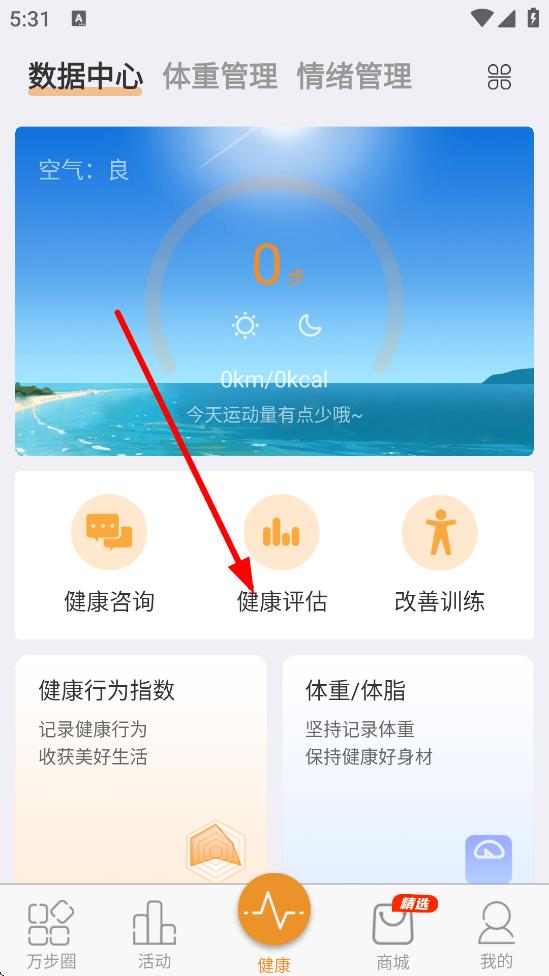 1、在健康页面,点击健康评估,进入健康评估页面。
