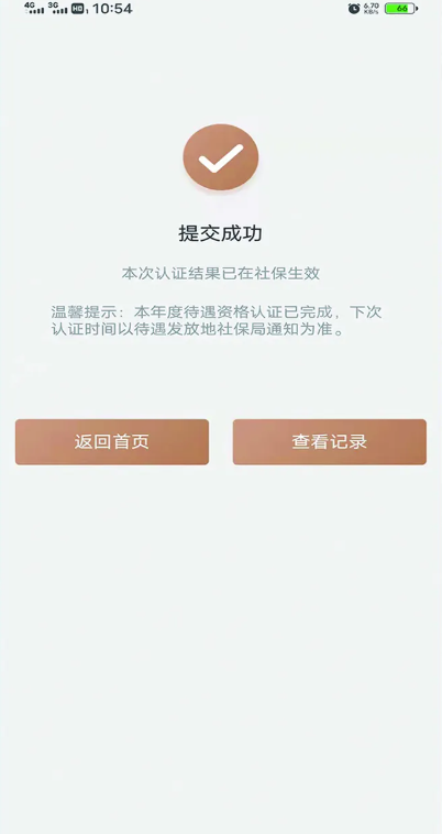 5.显示提交成功,即可完成待遇资格认证(待遇资格认证每年认证一次)。