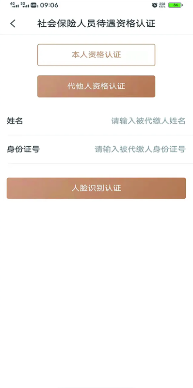 2.进入待遇资格认证页面,此页面支持本人资格认证或代他人资格认证