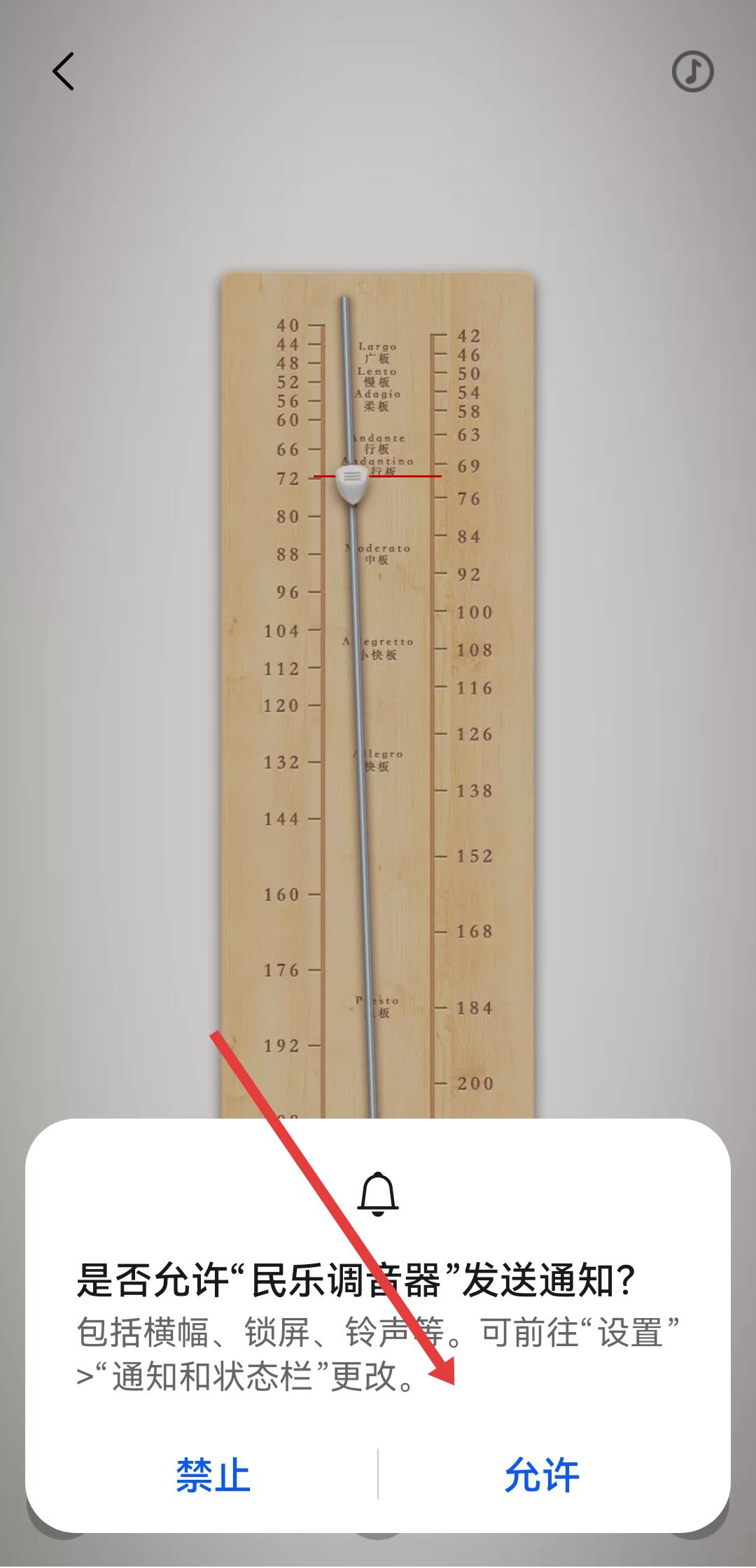 3、若弹出是否允许民乐调音器发送通知的权限请求框,点击允许关闭弹窗以继续操作。