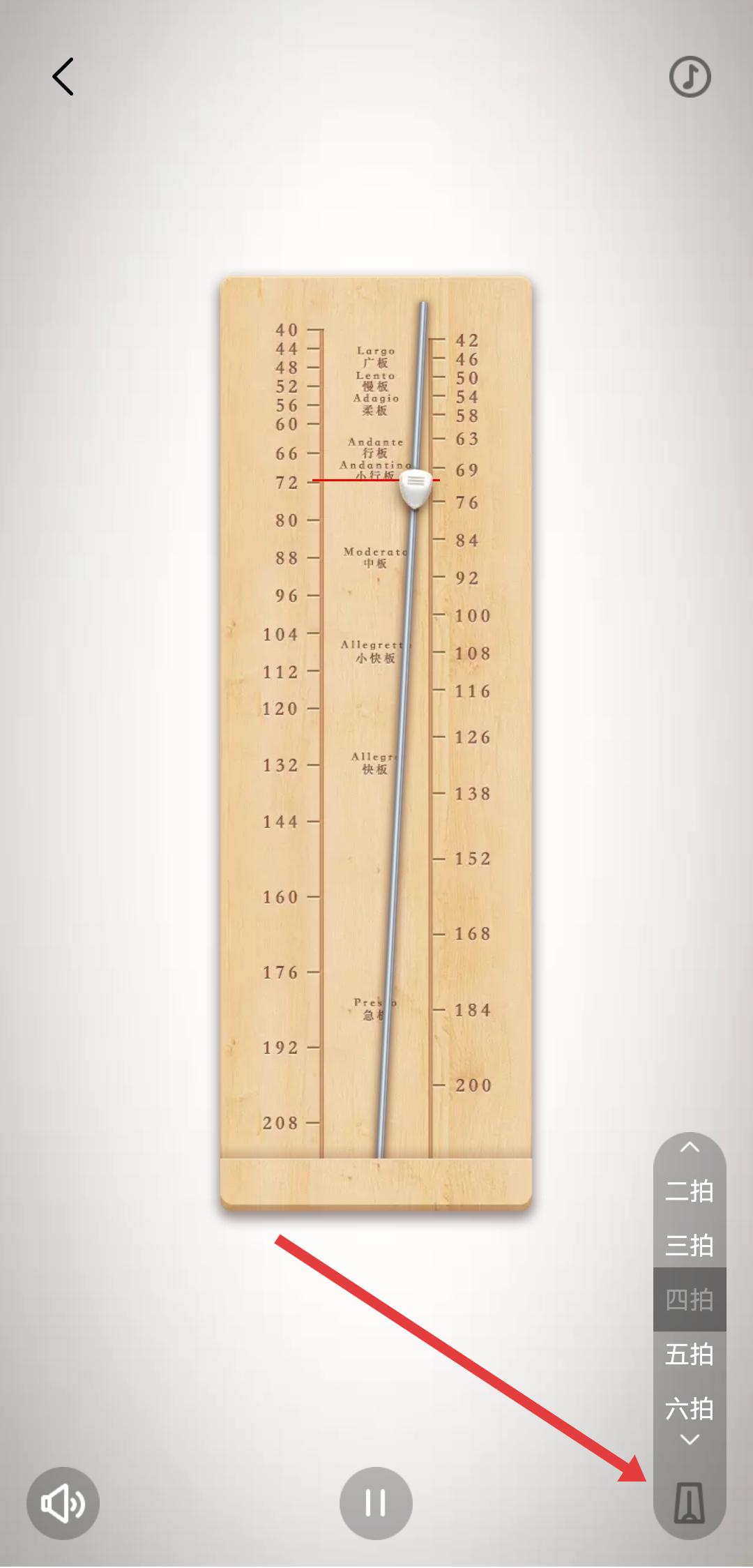 4、在节拍器界面下方,点击拍数选择按钮,并点击底部播放/暂停按钮控制节拍器运行。