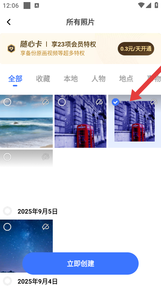4、在所有照片页面,勾选需要导入的照片后点击创建,将手机相册中的照片导入一刻相册。