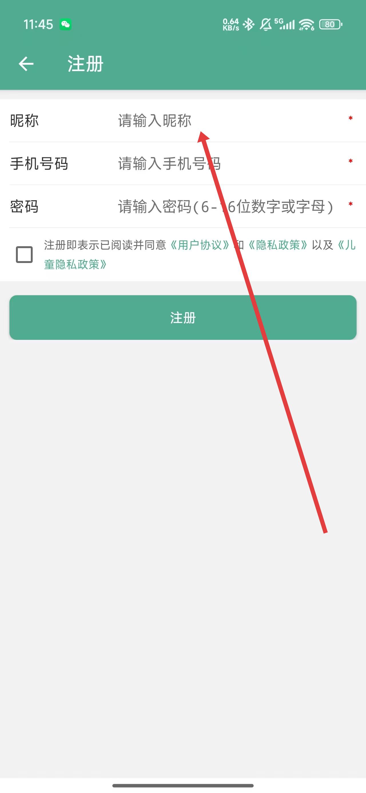 4、在跳转到注册页面后,点击输入框填写昵称以及后续信息后,完成注册操作。