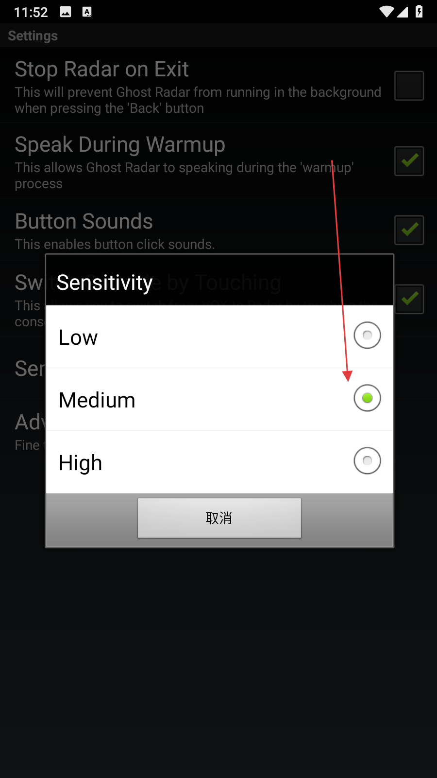 4、在弹出的灵敏度选择弹窗里,根据实际需求选择灵敏度,点击对应的选项,完成灵敏度的调整。