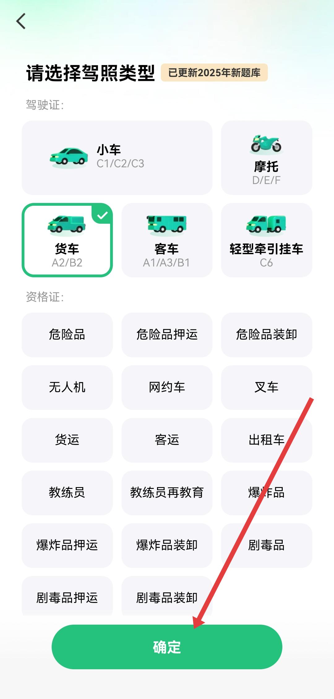 3、在请选择驾照类型页面,选择目标车型,点击底部的确定按钮。