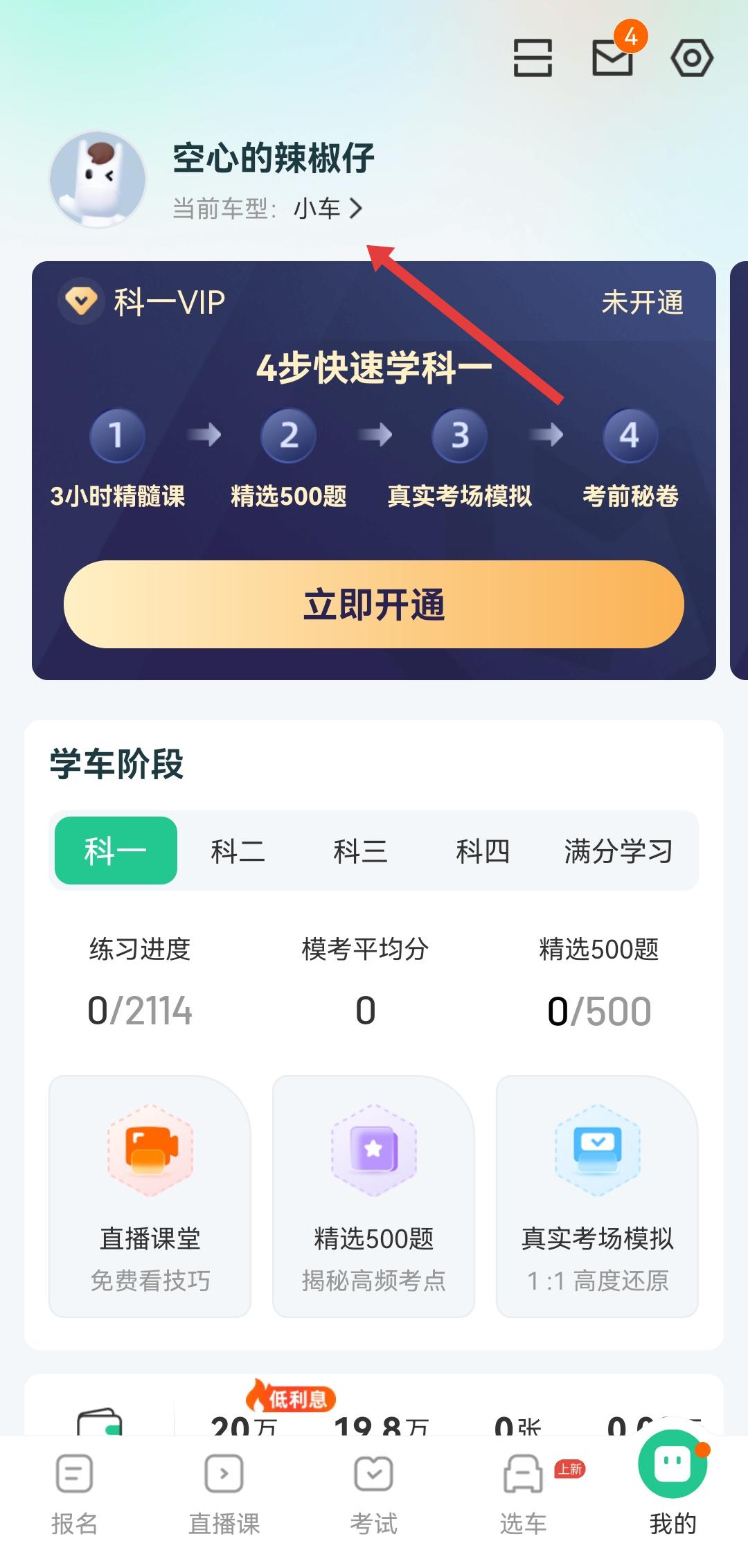 2、在我的页面中,找到当前车型区域如显示当前车型小车,点击进入驾照类型选择界面。