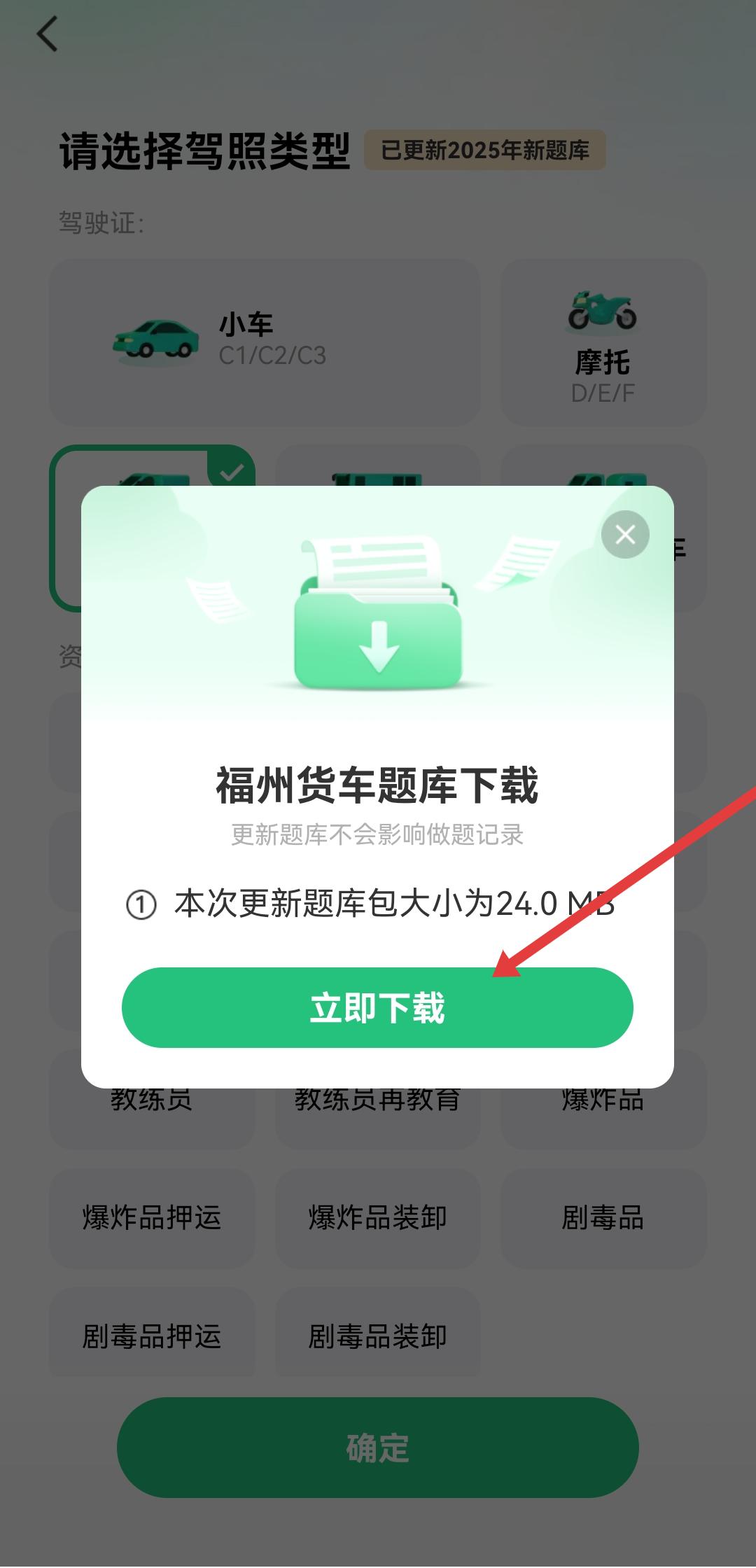 4、系统弹出对应车型的题库下载提示,点击立即下载,完成车型切换及题库更新。
