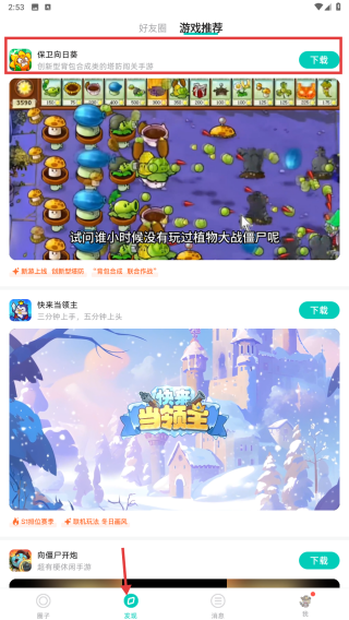 2、点击底部发现选项,进入发现页面,浏览好友圈动态,查看保卫向日葵、快来当领主等游戏推荐。