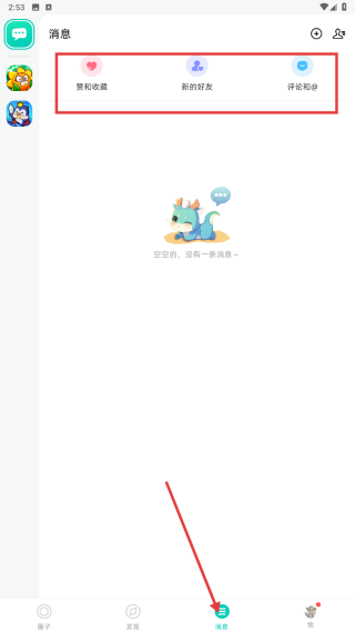 3、点击底部消息选项,进入消息页面,查看赞和收藏、新的好友、评论和@等消息通知。
