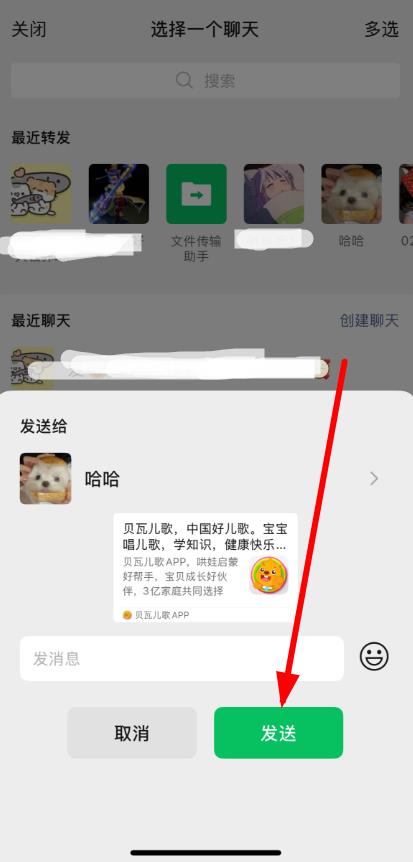 4、以微信为例,选择微信后会跳转到微信聊天选择界面,选择要分享的好友,点击发送,朋友就能收到分享并收听贝瓦儿歌了。