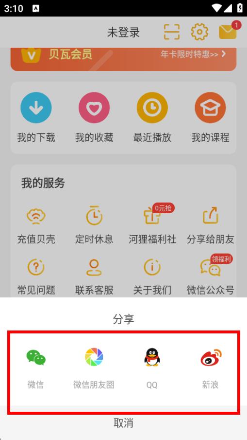 3、此时会弹出分享渠道选择框,可选择微信、微信朋友圈、QQ、新浪等渠道。
