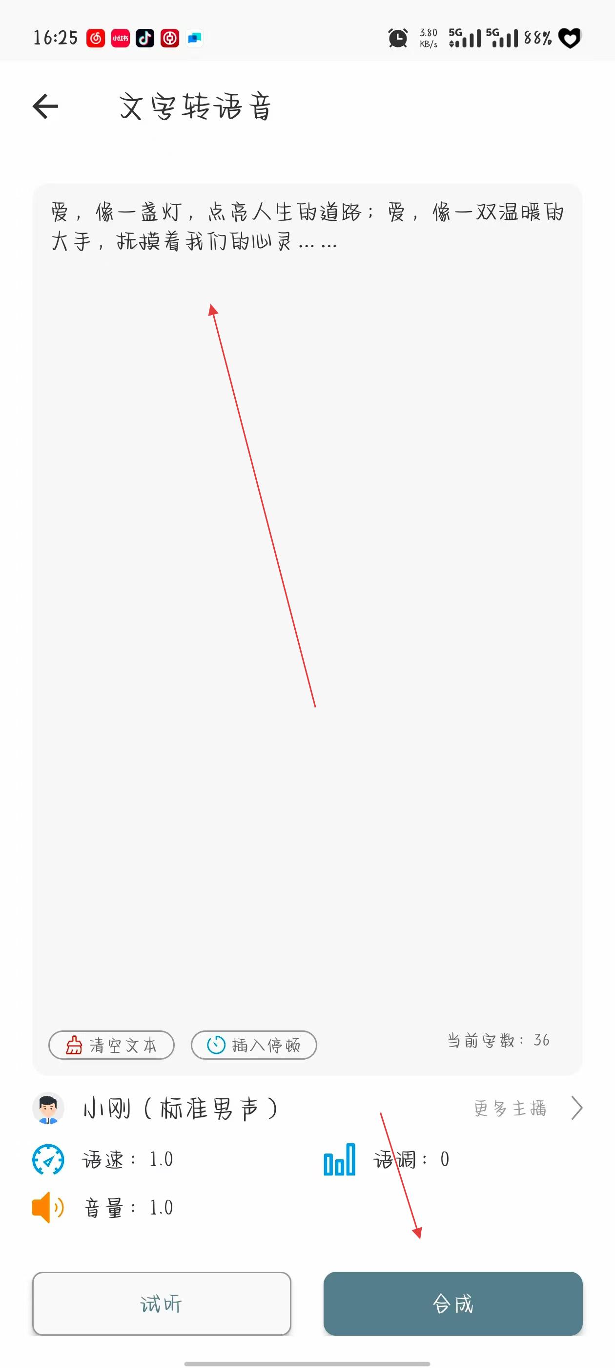 4、点击界面底部的合成按钮,应用会将输入的文字转换为语音,完成文字转语音操作。