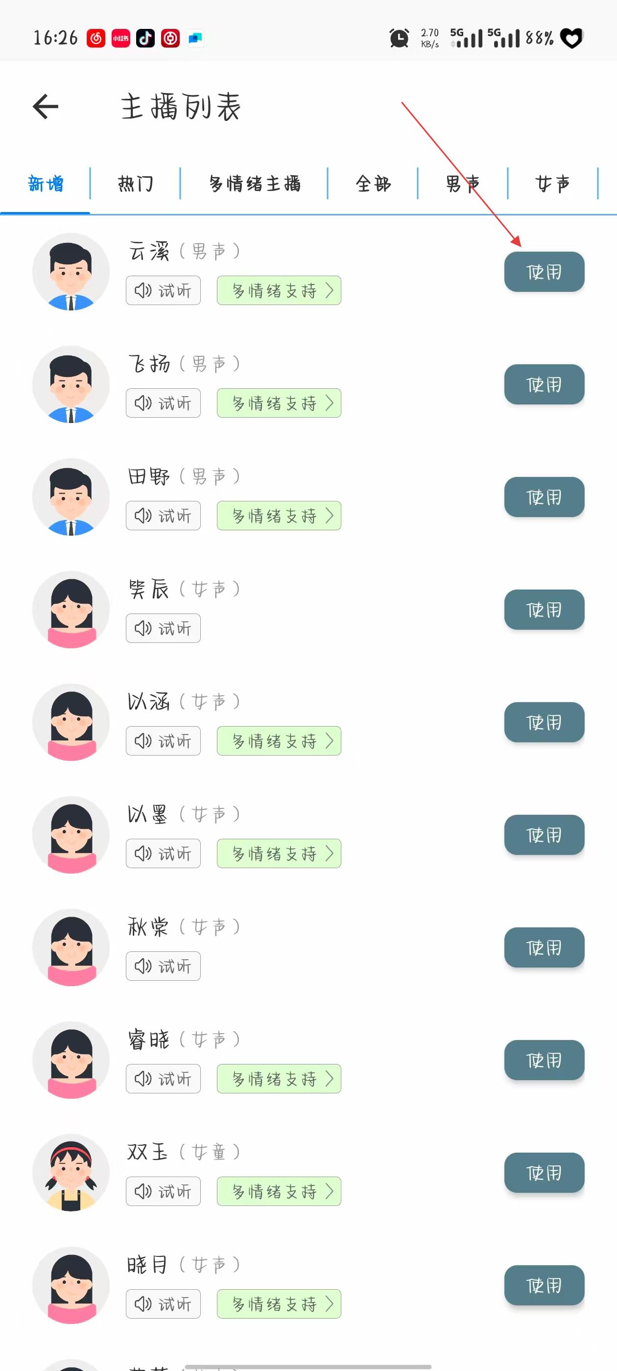 3、进入主播列表,挑选合适的主播后点击使用,选定该主播。