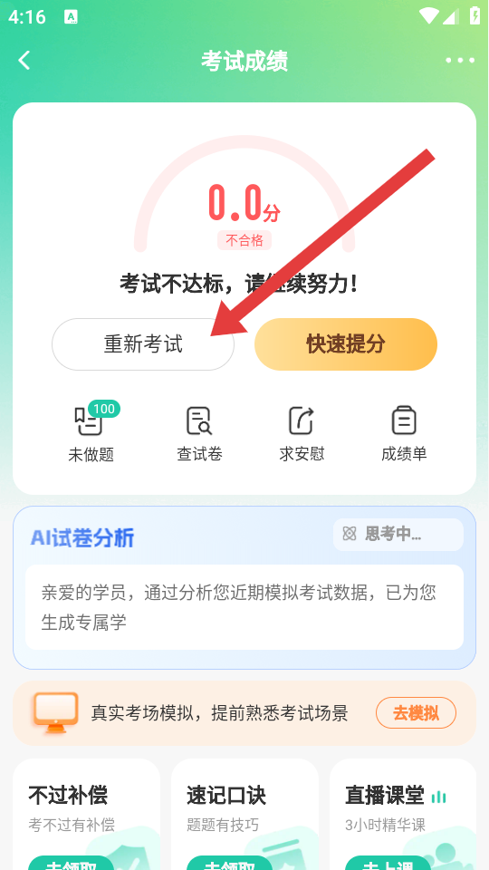 4、交卷后进入考试成绩页面,点击重新考试的按钮,即可重新开始模拟考试做题。