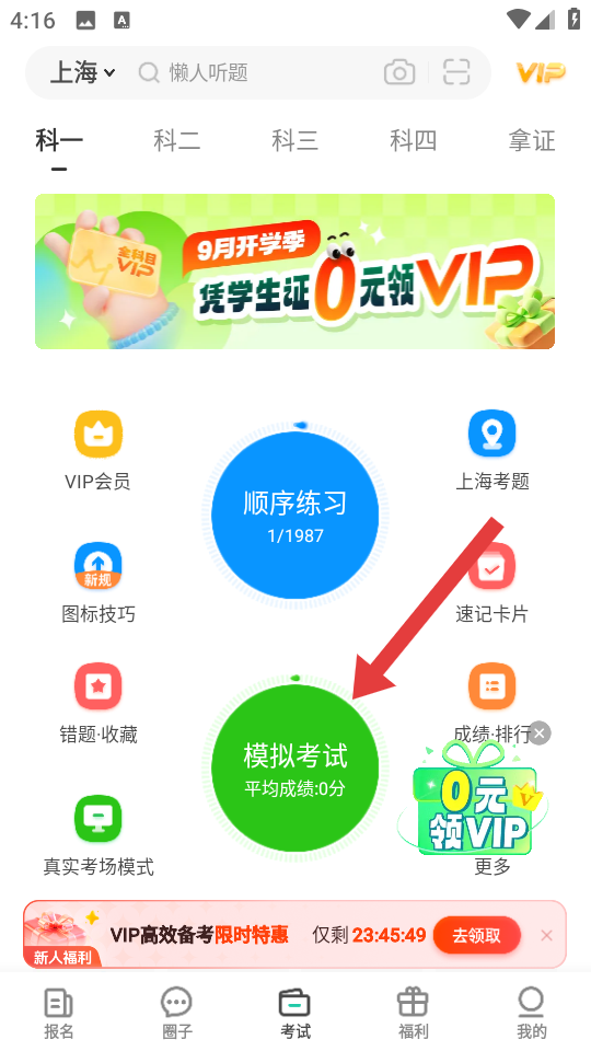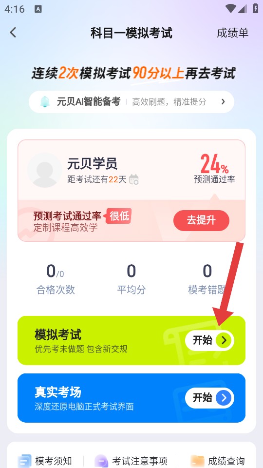 1、打开元贝驾考后,在主界面点击模拟考试按钮,进入模拟考试准备页面。