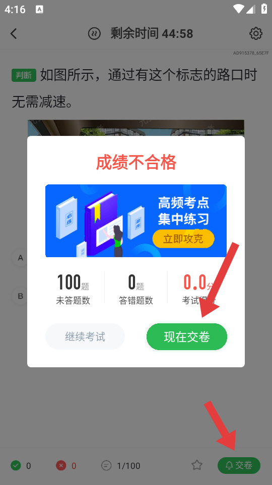 3、若要重新做题,在模拟考试答题过程中,点击右下角的交卷按钮,弹出成绩弹窗后,再点击现在交卷。