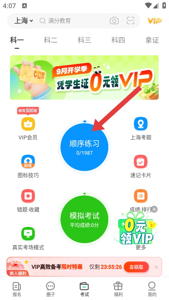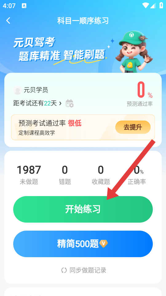 1、打开元贝驾考APP,在主界面点击顺序练习按钮,进入科目一练习页面。