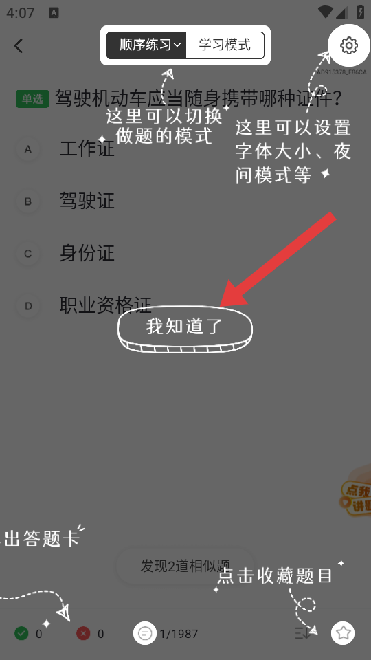 3、在答题引导弹窗中,点击我知道了的按钮,关闭提示并进入正式答题界面。